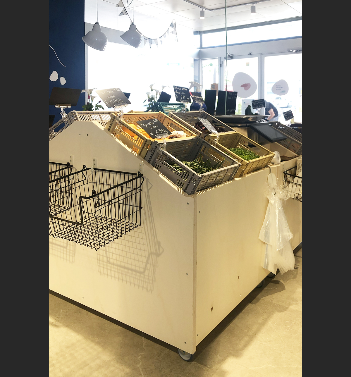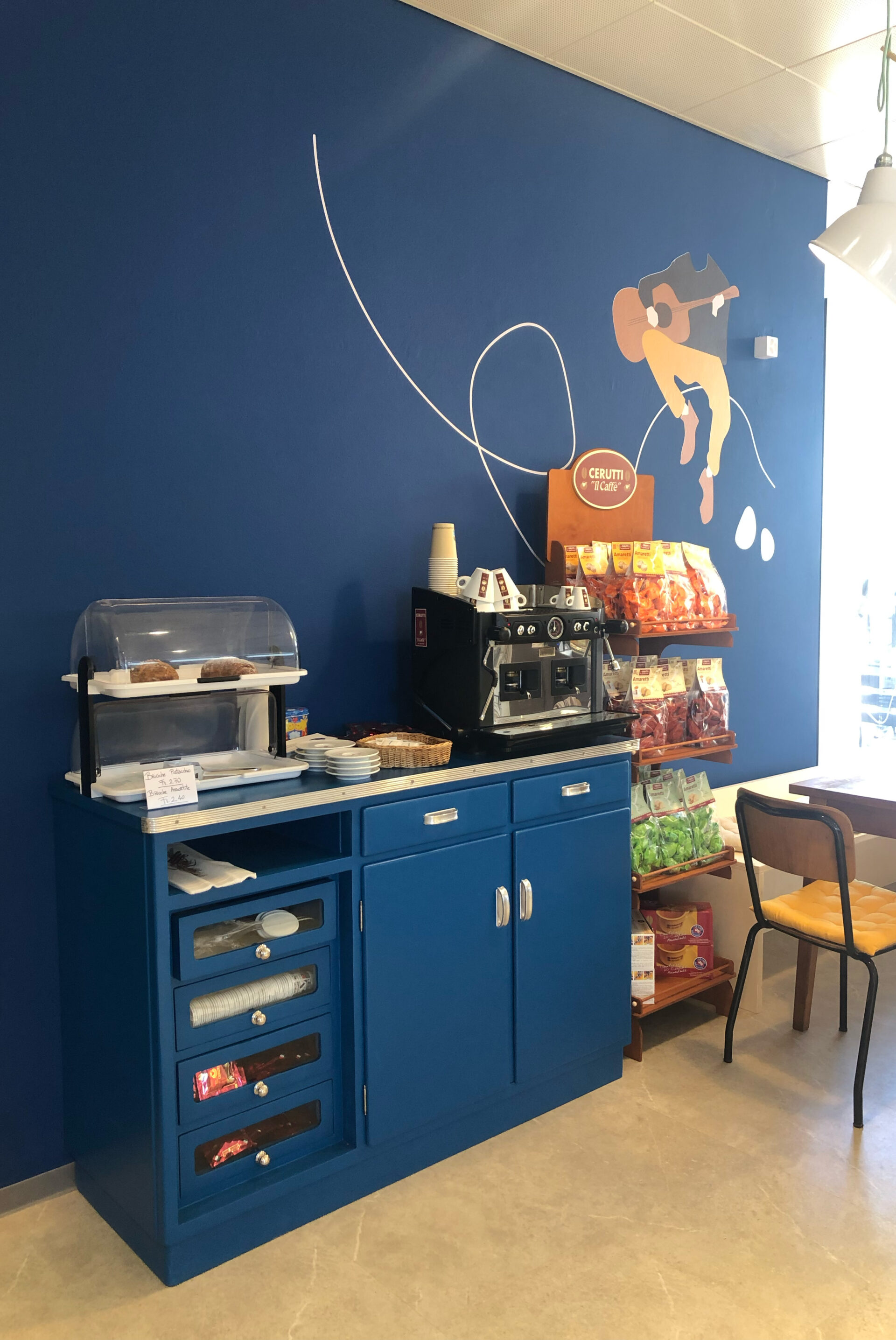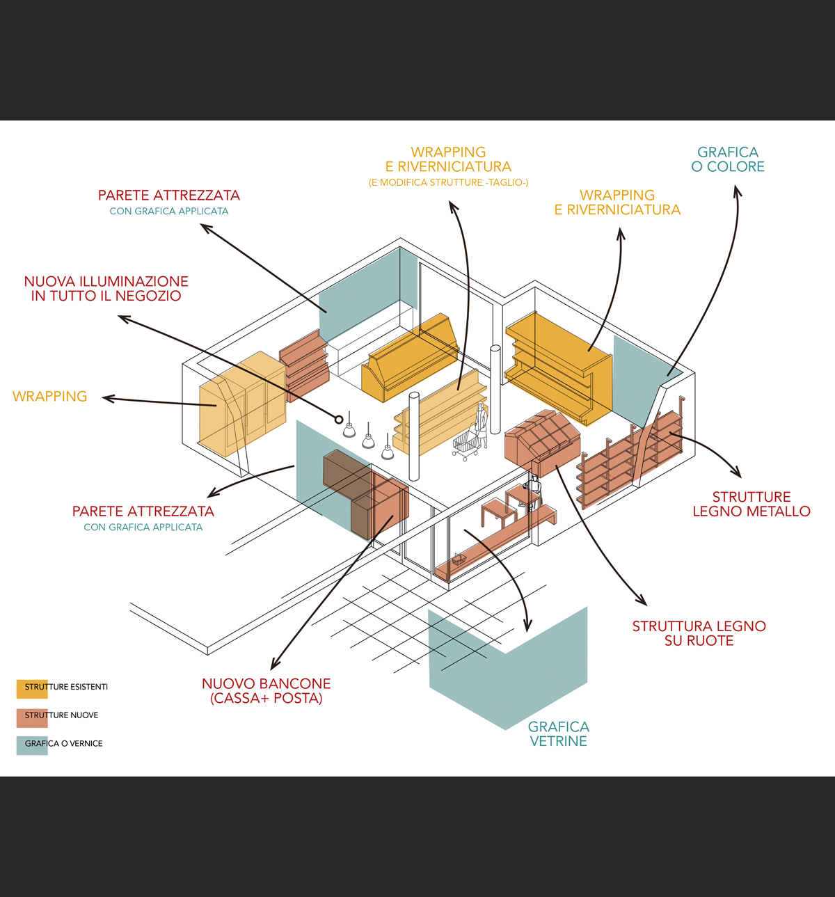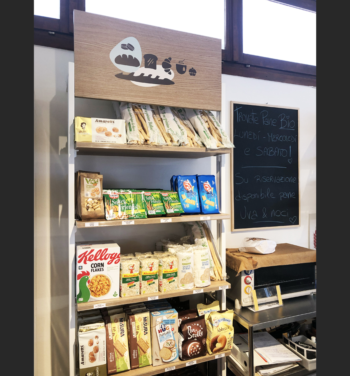 Bottega alimentare che promuove l’aggregazione. Ristrutturazione che ha privilegiato il riuso di strutture esistenti e mobili usati, in collab con l’atelier di falegnameria Midada.